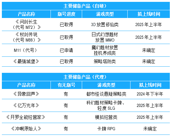 公司储备多款新品,,,,期待为玩家解锁更多新鲜体验,,,部分产品如下表所示:::