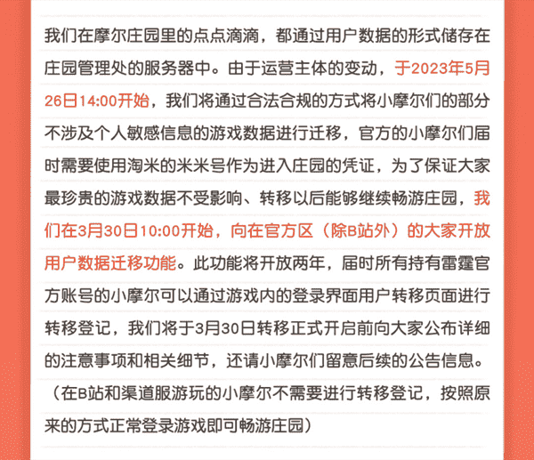 合作结束本就是开发方和代理方双方的事情,,,降低这件事情对玩家的影响,,,才是对所有珍视这段童年的摩尔玩家最好的呵护。。目前看来,,,用户完全不用担心后续因无法登录游戏而造成任何数据上的损失,,,只要及时进行账号转移,,,,就可以好好保留、、、延续在庄园的痕迹和回忆,,,继续在庄园里做快乐的红鼻子小鼹鼠。。。。