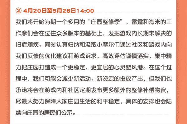 合作的结束并不意味着这个童年IP的结束,,,对于《摩尔庄园》手游而言,,,,这是一个新阶段的开始。。。后续游戏内将开启庄园重构计划,,会就以往遗留下来的BUG进行集中修复,,,,并在游戏内和社区定期发布更多补偿物资。。。。