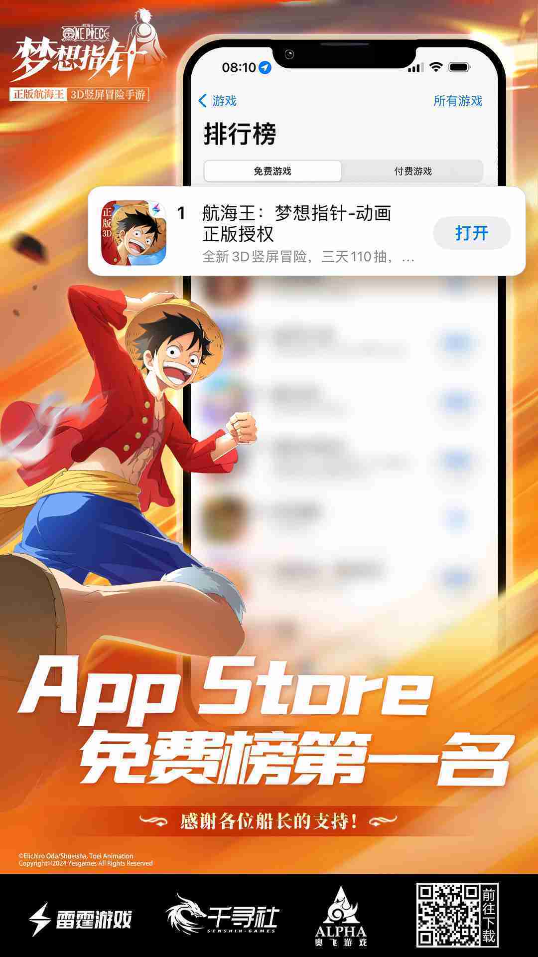 产品新闻 《航海王:::梦想指针》登顶App Store免费榜,,公测福利汇总!!!!