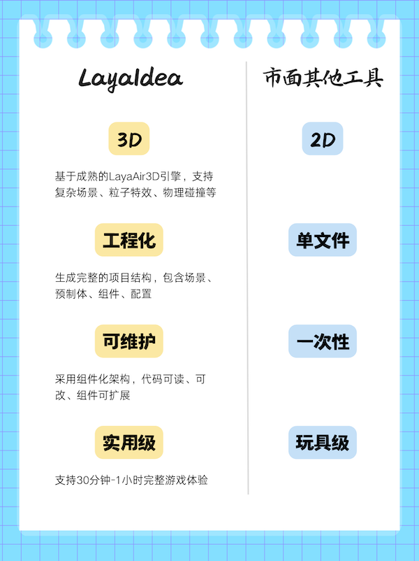 基于LayaAir引擎,,,LayaIdea构建了一套完整的工业级AIGC开发流程,,,,实现了从策划文档到完整3D游戏项目的自动化生成,,,,与市面现有AIGC工具在技术能力、、、实用性上形成显著差异,,,具体对比如下::::
